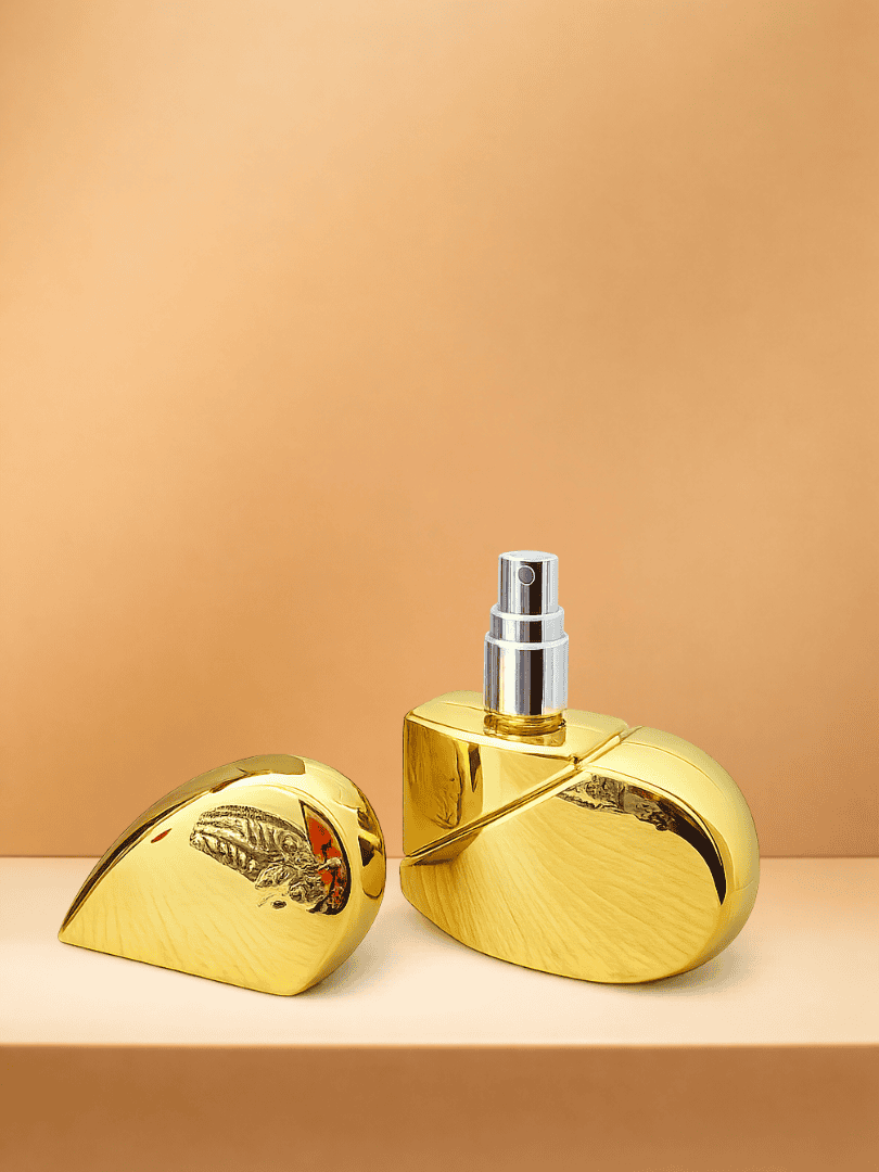 Impressive perfume spray bottle in a heart-shaped design, in a bright gold color with a glossy finish that exudes passion and elegance. A distinctive design that catches the eye, making it ideal for a gift or decoration.